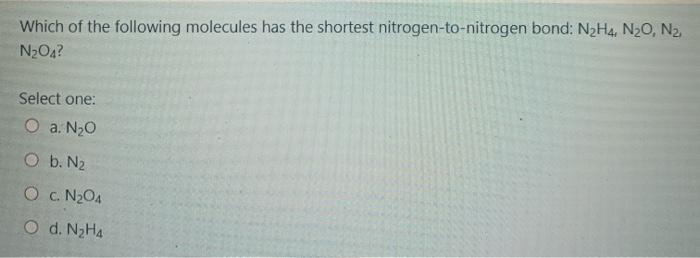 Mathrm N_ 2 mathrm H_ 4 mathrm N_ 2 mathrm O mathrm N_ 2 mathrm N_ 2 mathrm O_ 4. In which of the following molecules would you expect the nitrogen-to-nitrogen bond to be the shortest. N 2 N 2 H 2 N 2 H 4.